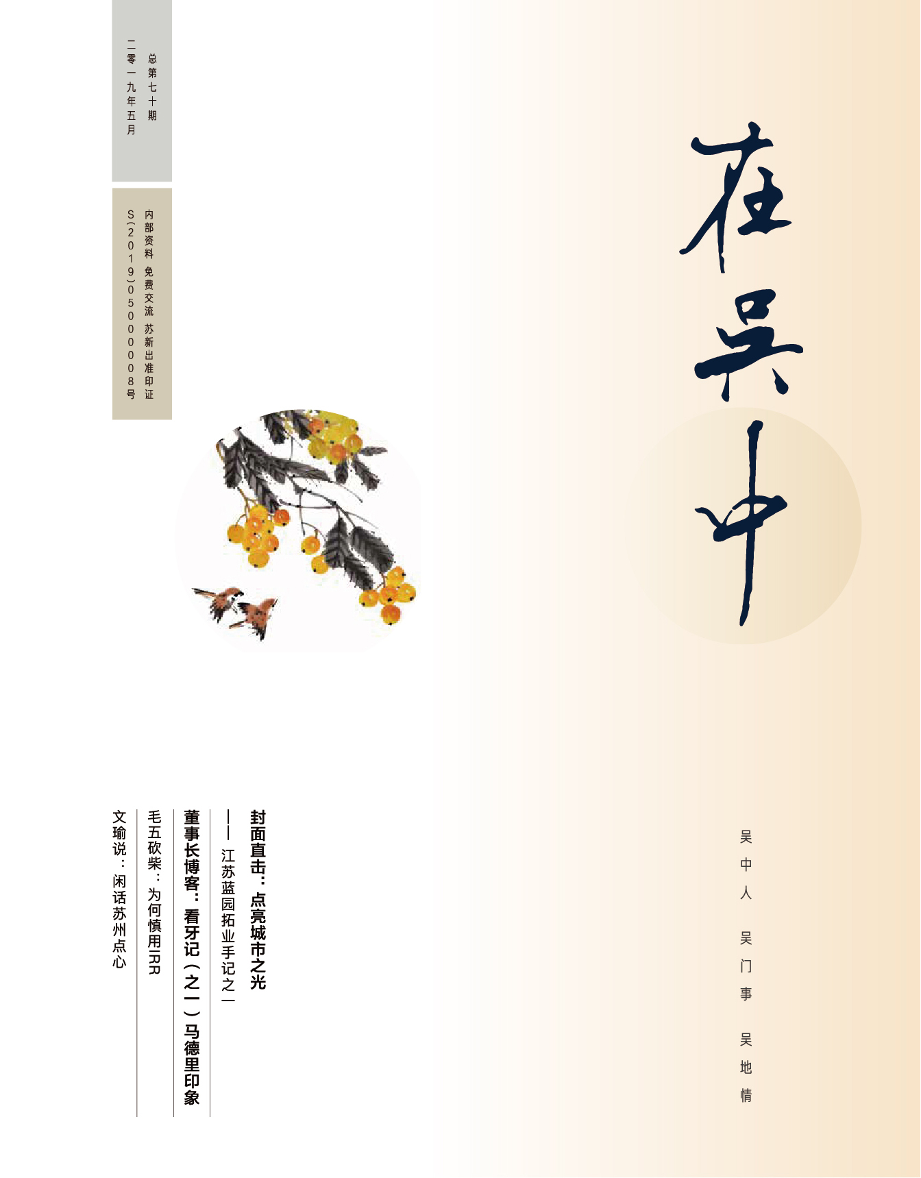 《在吳中》創(chuàng)刊于2005年,蘇州市十佳內(nèi)刊。以述吳中人、記吳中事、傳吳中情為宗旨,堅(jiān)持記錄吳中集團(tuán)的發(fā)展,為品牌建設(shè)發(fā)展助力?!对趨侵小穯纹谟∷?500冊(cè),主要用以企業(yè)內(nèi)部交流,其意在傳達(dá)的吳中集團(tuán)的力量、文化和精神。每期《在吳中》都記載著吳中人工作、學(xué)習(xí)、生活的實(shí)時(shí)動(dòng)態(tài),所見所聞、所思所想、所作所為,總結(jié)借鑒企業(yè)經(jīng)營管理之道,汲取吳地人文精髓,廣受社會(huì)各界的好評(píng)和認(rèn)可。